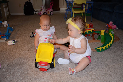 Uh oh! Our girly girls are playing with dump trucks. Haha! I hate to admit this, but Miss Maddy has actually been acting rough and tough for a couple months now and losing some of her girly qualities. Our pink, satin, and bows might come to an end sooner than this mommy would like....